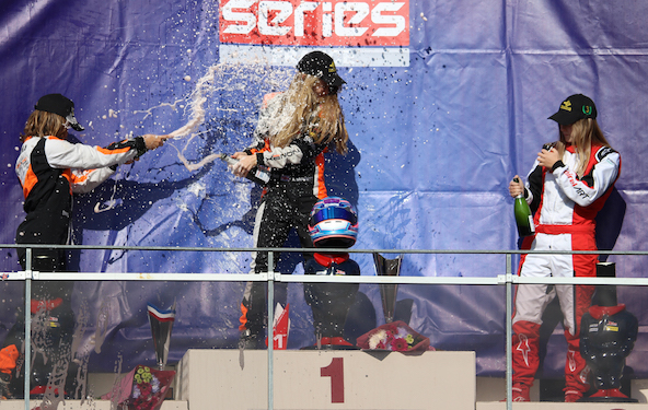 Derrière une excellente Luna Cleret, 2e, la Luxembourgeoise Zoé Knebler (Birel ART) avait la joie d’escalader la 3e marche de ce podium très européen. Grâce à un excellent départ, une remontée endiablée et le meilleur tour en course, Caroline Candas s’est retrouvé en position d’accéder elle-aussi au très convoité piédestal, mais devait se satisfaire de la 4e place devant Manon Augier (Kosmic) et Emma Servier (Birel ART), elles-aussi dans le coup.