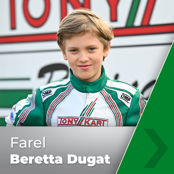 Brillant depuis qu’il a décidé de courir en Italie en Mini, et après une expérience en OK-N Junior en fin de saison dernière, Jean Poujol accède à la catégorie OK-Junior. Encore U10 il y a un an, Farel Beretta Dugat fera partie de l’effectif Tony Kart en Mini 60 “groupe 3”. Farel est le fils d’Olivier Beretta, ex kartman aux excellents résultats à la fin des années 80 avant de courir en F1 en 1994 puis en Endurance.