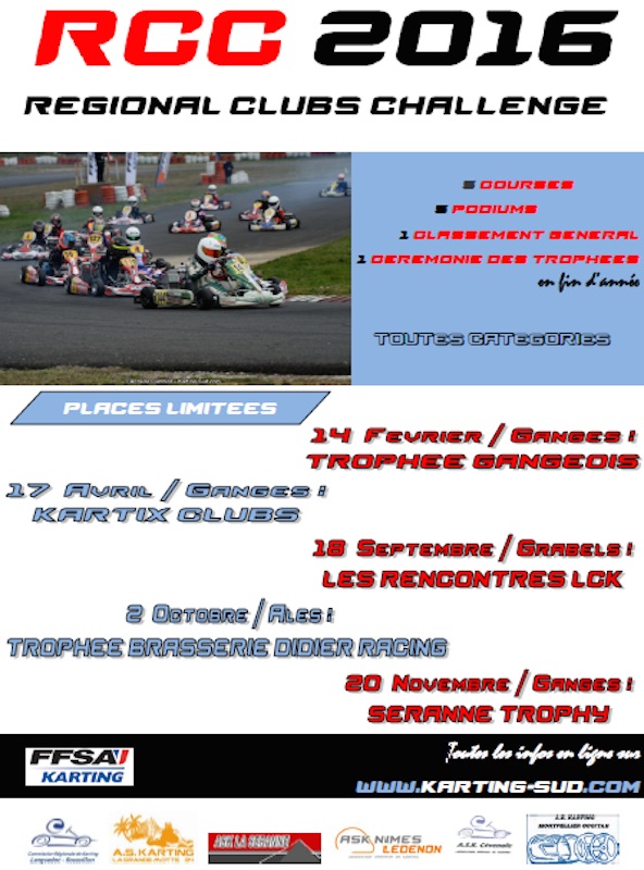 Regional-Clubs-Challenge-Nouvelle-appellationCela ne modifie absolument en rien le règlement et le déroulement de la série Languedocienne, seul le nom change. A noter que la première épreuve de ce challenge disputée à Ganges a réuni 79 pilotes dès le 14 février. Rendez-vous le 17 avril pour la deuxième des cinq épreuves, avec le Kartix Clubs à Ganges.