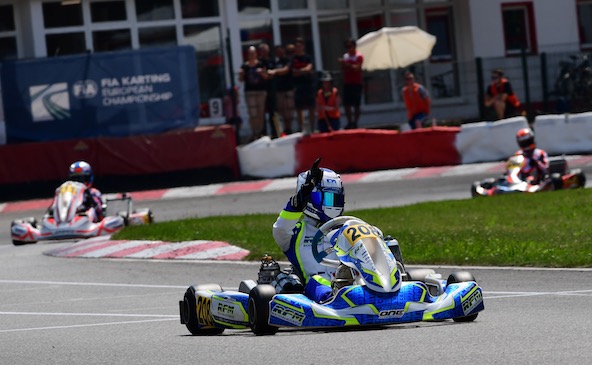 Devant lui, Paul Aron (FA Kart-Vortex) a d’entrée pris les rênes de la course, avant de s’envoler vers la victoire. Déjà victorieux à Sarno, l’Estonien du team RFM a récupéré la première place au général et apparaît de plus en plus comme le favori au titre.