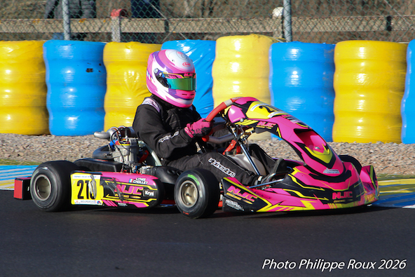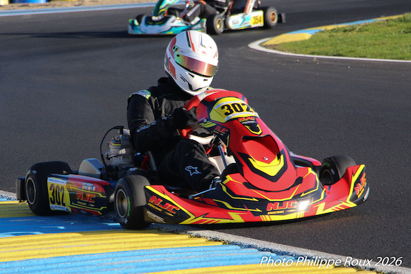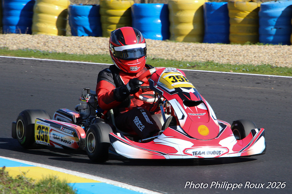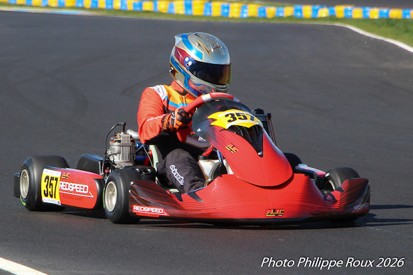 Engagé en Senior en 2025, Adrien a décidé de faire le grand saut en KZ2 cette saison, avec beaucoup de choses à découvrir: frein avant, boîte de vitesses, départ arrêté, moteur brutal, pilotage physique… Le tout dans un peloton relevé de plus de 50 pilotes ! Cela s’est terminé par une progression régulière et la 8e place en finale B.