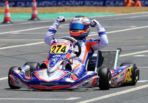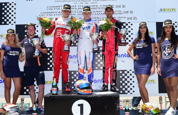 Déjà vainqueur en 2015 de cette manche européenne à Portimao avec Kenny Roosens, l’équipe belge VDK Racing a encore réussi un nouvel exploit dans ce contexte relevé avec un pilote très prometteur. Il faut surtout souligner la manière avec laquelle Victor Martins (Kosmic-Parilla) s’est imposé. Le pilote du Programme 10-15 FFSA a pris les commandes dans sa préfinale en réalisant le record du tour, avant d’imposer une cadence infernale en tête la finale. Avec un nouveau meilleur tour, il s’imposait avec plus de sept secondes d’avance !