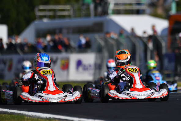 En OK-Junior, le Français Enzo Déligny (Parolin-TM) a encore confirmé tout le bien qu’on pensait de lui en revenant de la 17e à la 9e place en finale, avec des d’excellents temps au tour. Hélas, lui aussi était pénalisé, l’obligeant à se contenter de la 24e place. Devant lui, deux autres Tricolores ont montré de belles choses en dépit d’essais chronométrés difficiles. Il s’agit de Jules Caranta (Exprit-Vortex) et Matteo Spirgel (Birel ART-TM). Tous les deux se sont mis en valeur en préfinale, avant de subir les bousculades du début de finale.